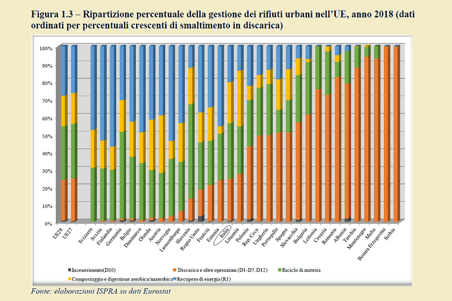Può essere indotto in errore chi osserva il grafico sullo smaltimento dei rifiuti urbani messo a punto dall’Ispra, ente statale per la protezione e la ricerca ambientale. Chi osserva il dato nazionale potrebbe ritenere, infatti, lo stato della gestione dei rifiuti perfettamente in linea alla media europea, perfino riguardo all’elemento che presenta maggiori criticità, come è quello dei conferimenti in discarica.