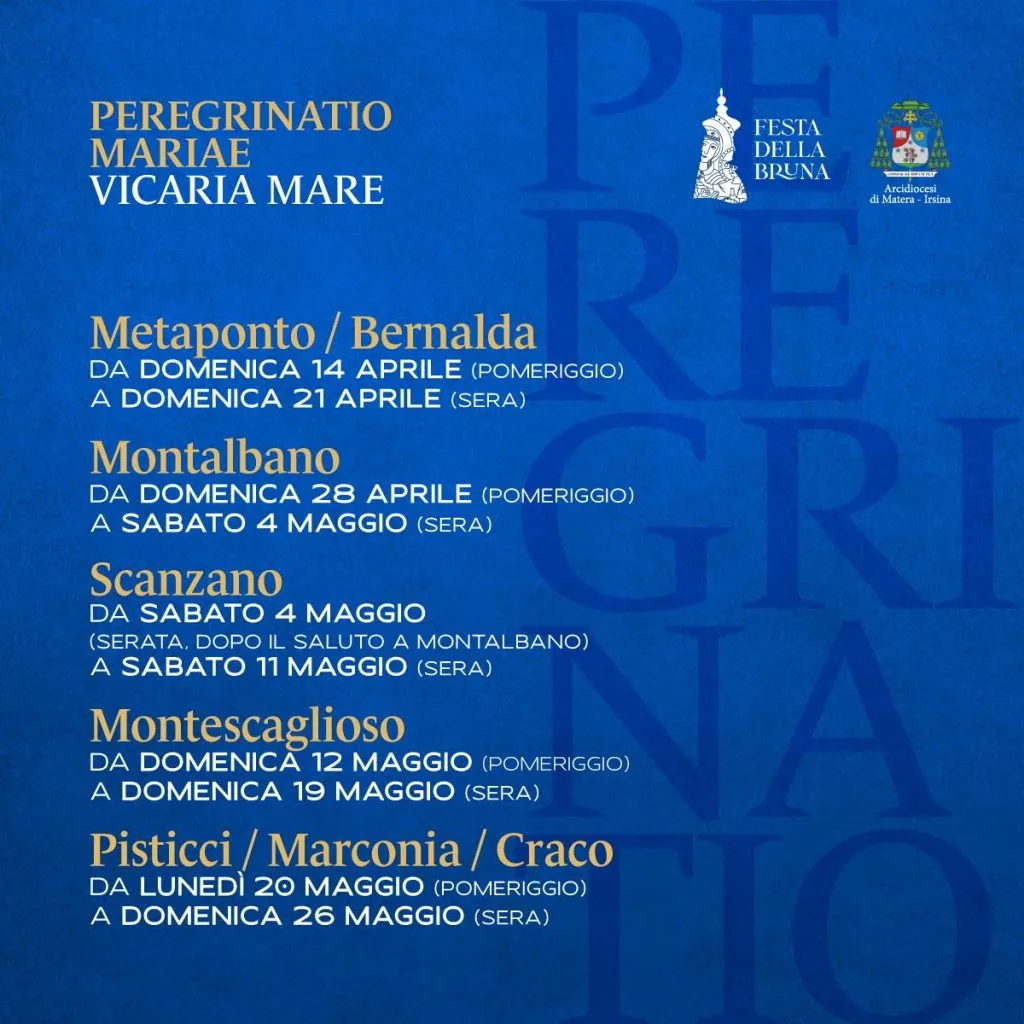 Quest’anno, dal 14 aprile al 26 maggio, la Madonna della Bruna visiterΓ  i comuni della Vicaria Mare dell’Arcidiocesi di Matera-Irsina.