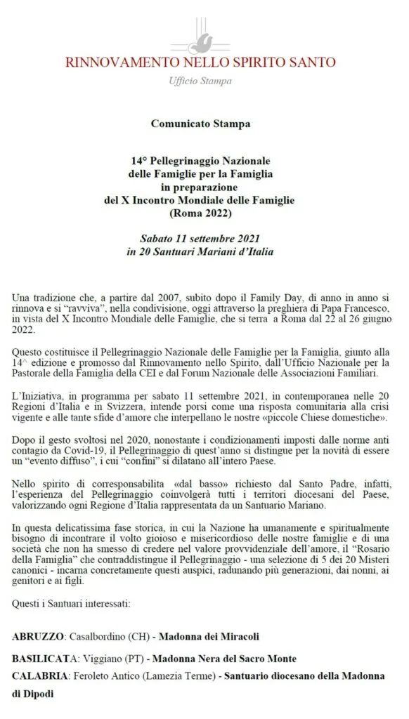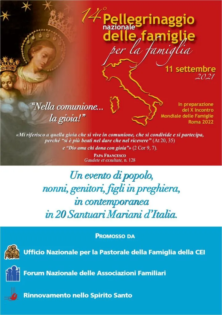 In vista del X Incontro Mondiale delle Famiglie, che si terrà a Roma dal 22 al 26 giugno 2022, é stato organizzato dal Rinnovamento nello Spirito, dall’Ufficio Nazionale per la Pastorale della Famiglia della CEI e dal Forum Nazionale delle Associazioni Familiari la 14^ edizione del Pellegrinaggio Nazionale delle Famiglie per la Famiglia.