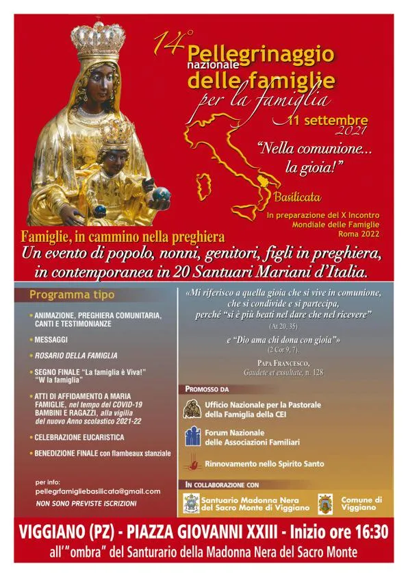 In Basilicata, l’11 settembre 2021, il Pellegrinaggio sarà realizzato a Viggiano in Piazza Giovanni XXIII all’ombra del Santuario della Madonna Nera del Sacro Monte con appuntamento alle 16,30.