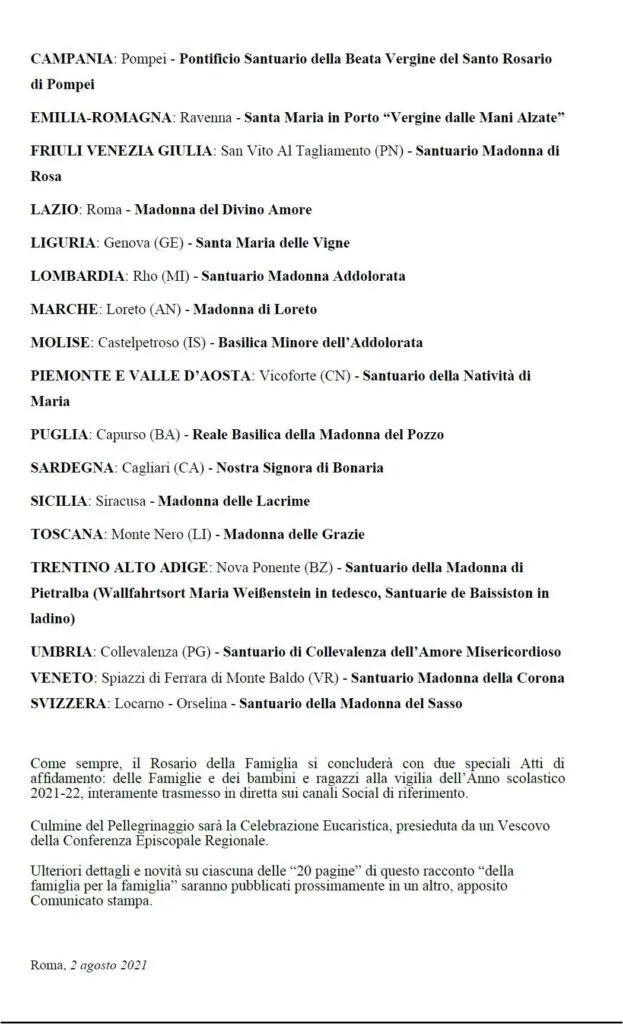 Come sempre, il Rosario della Famiglia si concluderà con due speciali Atti di affidamento: delle Famiglie e dei bambini e ragazzi alla vigilia dell’Anno scolastico 2021-22, interamente trasmesso in diretta sui canali Social di riferimento.