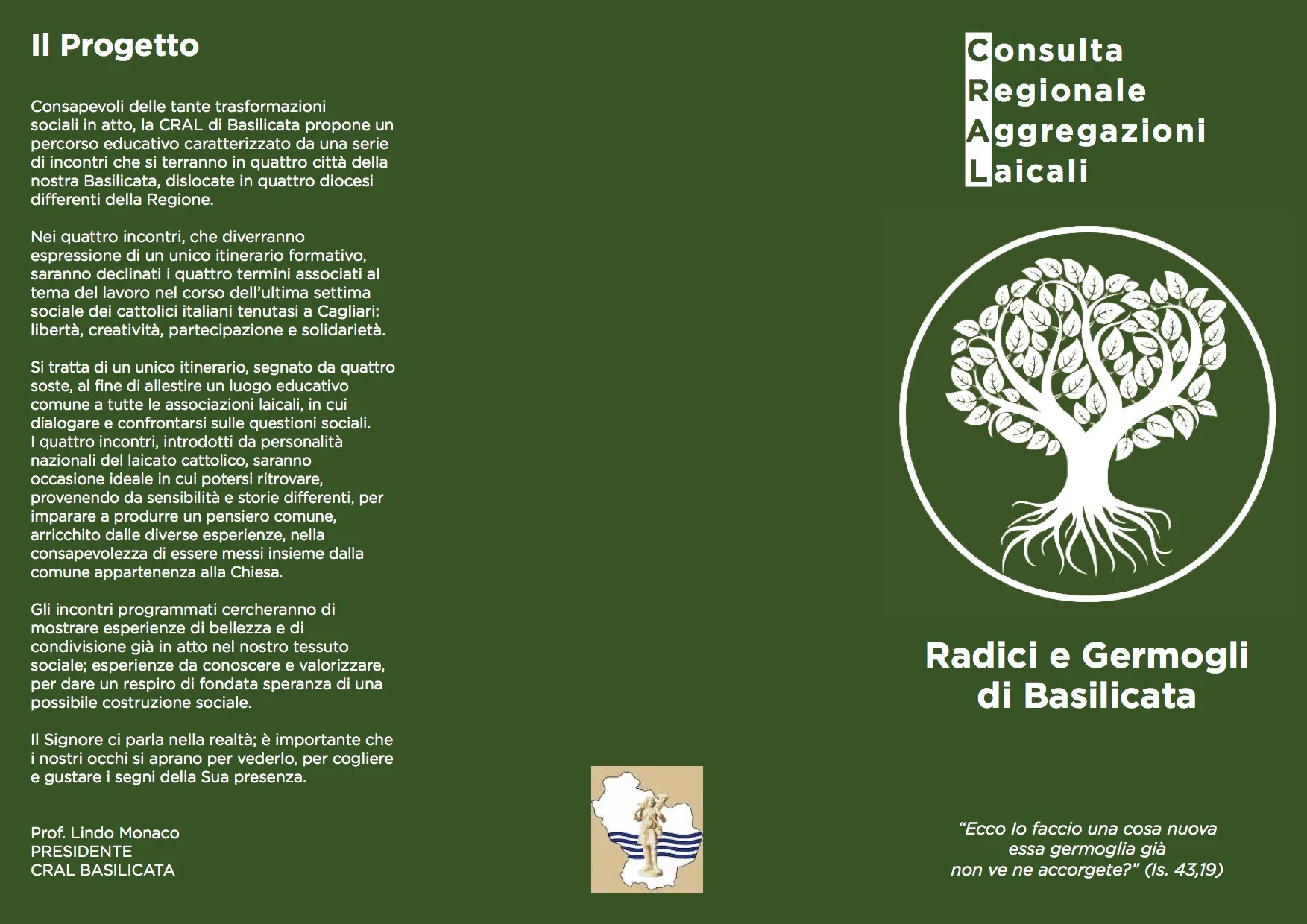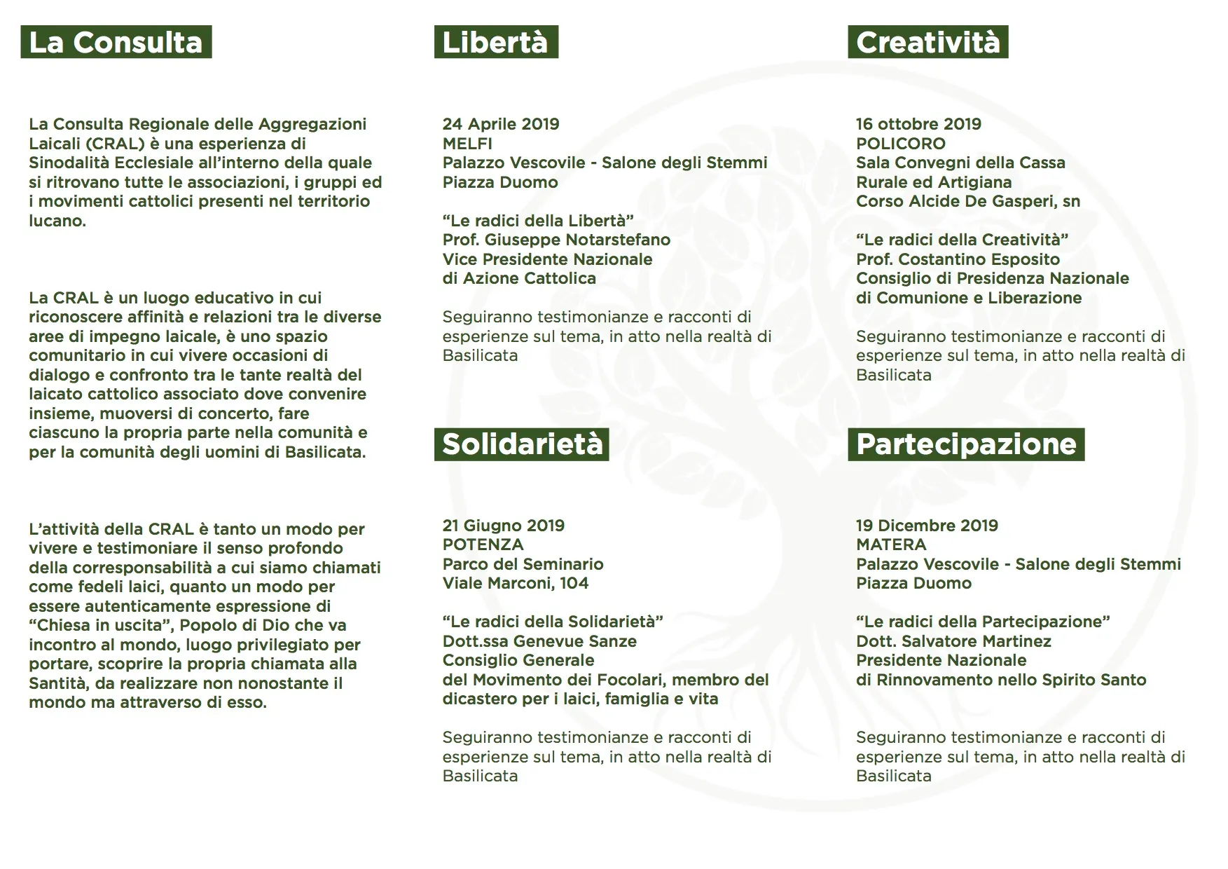 Con questi presupposti è nato il progetto “Radici e Germogli” di Basilicata, caratterizzato da una serie di incontri che si sono tenuti in quattro città dislocate in quattro diocesi differenti della Regione. Nei quattro incontri, divenuti espressione di un unico itinerario formativo, sono stati declinati i quattro termini associati al tema del lavoro approfonditi nel corso dell’ultima settima sociale dei cattolici italiani tenutasi a Cagliari: libertà, creatività, partecipazione e solidarietà.