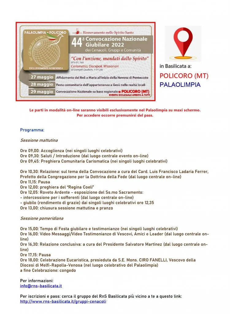 Dopo gli ultimi due anni segnati dalla pandemia, che ha fortemente limitato gli eventi comunitari, per il Rinnovamento nello Spirito Santo è tempo della 44^ Convocazione Nazionale, prevista nell’Anno del Giubileo d’Oro, dal 27 al 29 maggio 2022. Data l’impossibilità di tornare a vivere il tradizionale evento alla Fiera di Rimini, le giornate si svolgeranno su base regionale, in differenti modalità, ma secondo il medesimo fine: raggiungere quanti più fratelli e sorelle, secondo lo stile sinodale già sperimentato nel novembre scorso per la 45^ Conferenza Nazionale Animatori.