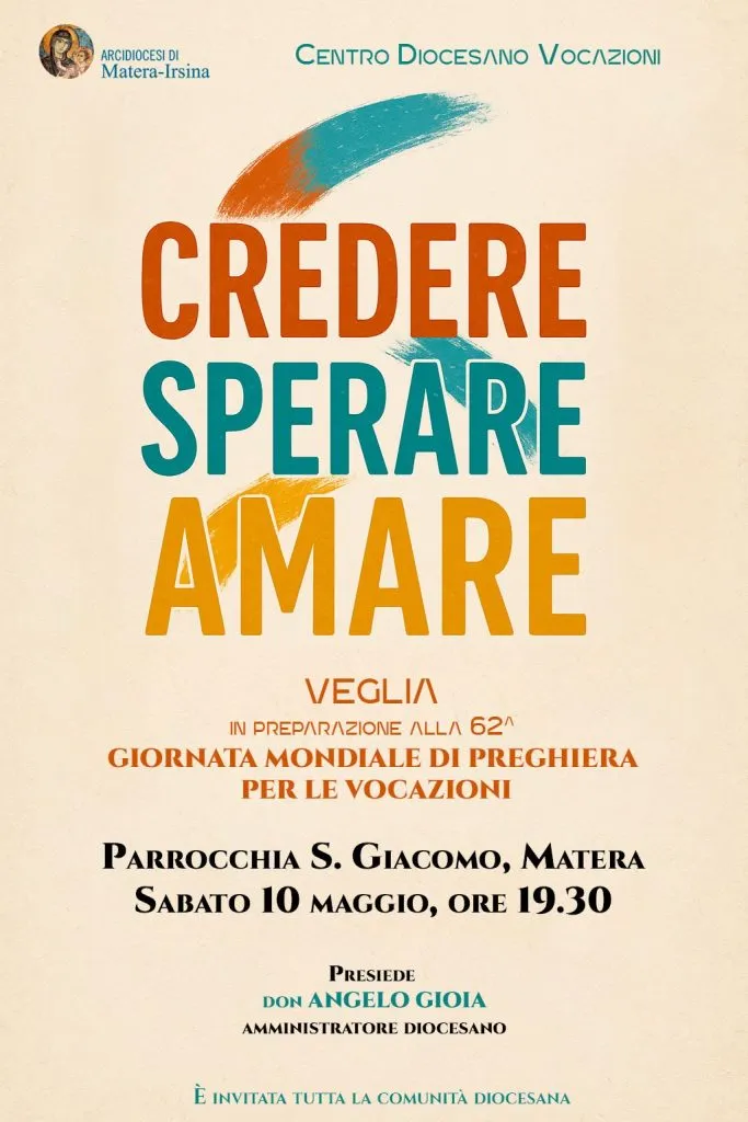 Nella coscienza, seppur forse riscoperta di recente, che è stato proprio Gesù a chiedere di pregare il padrone della messe perché mandasse operai nella sua messe, ecco i diversi momenti di preghiera vocazionale che in molte comunità parrocchiali sono previsti durante l’anno e che culminano poi con la Veglia di preghiera diocesana per le vocazioni organizzata dall’Ufficio Diocesano per le Vocazioni “Credere, sperare, amare”, che don Angelo, amministratore diocesano, presiederà sabato 10 maggio alle ore 19:30 nella Parrocchia di “San Giacomo” a Matera. Tutta la comunità diocesana è invitata.