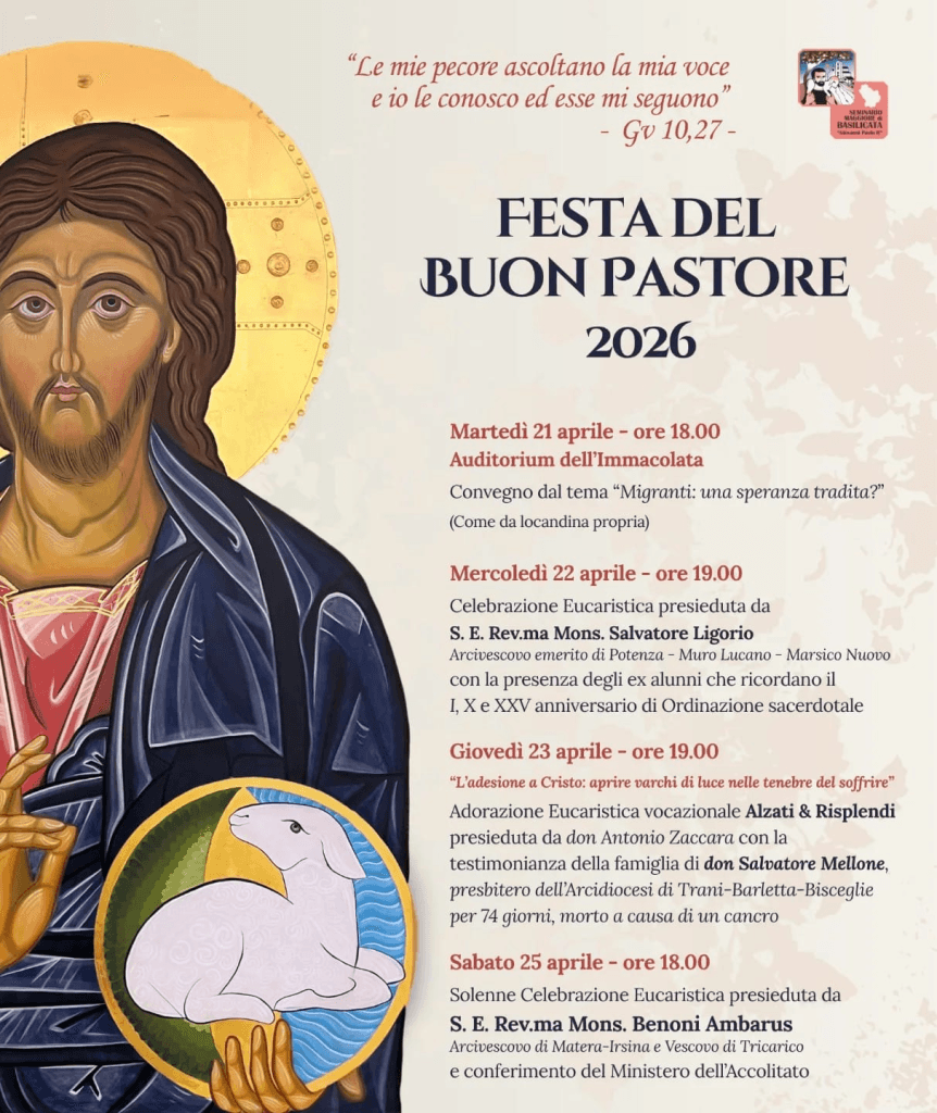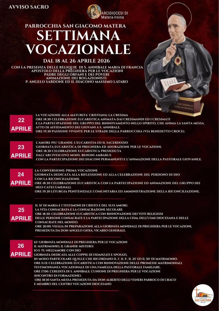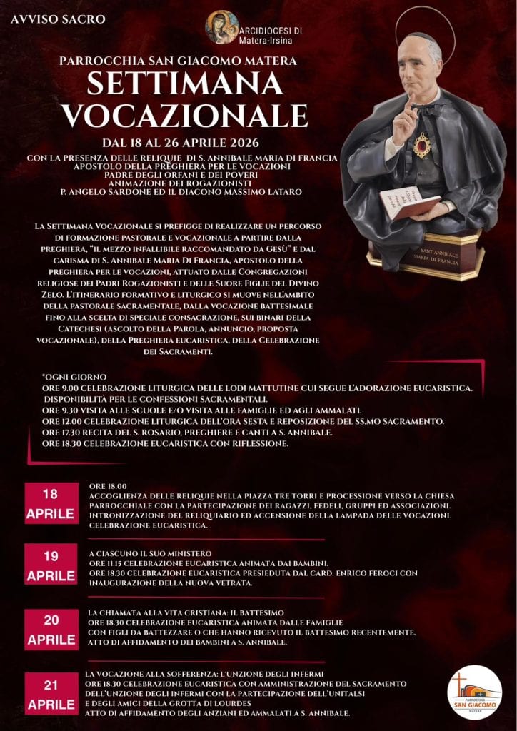 Un intero ottavario animato dai padri rogazionisti, con la presenza delle reliquie di Sant’Annibale, inizia oggi nella parrocchia di San Giacomo in preparazione alla 63ª Giornata Mondiale di Preghiera per le Vocazioni (26 aprile). Papa Leone nel suo messaggio invita a riscoprire la dimensione dell’interiorità proponendo la figura di Samuele che sentì la chiamata del Signore nel silenzio della notte. In seminario, a Potenza, sabato ricevono l'accolitato diversi seminaristi della diocesi.