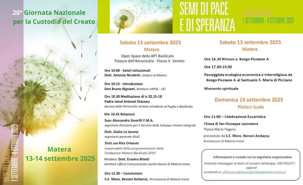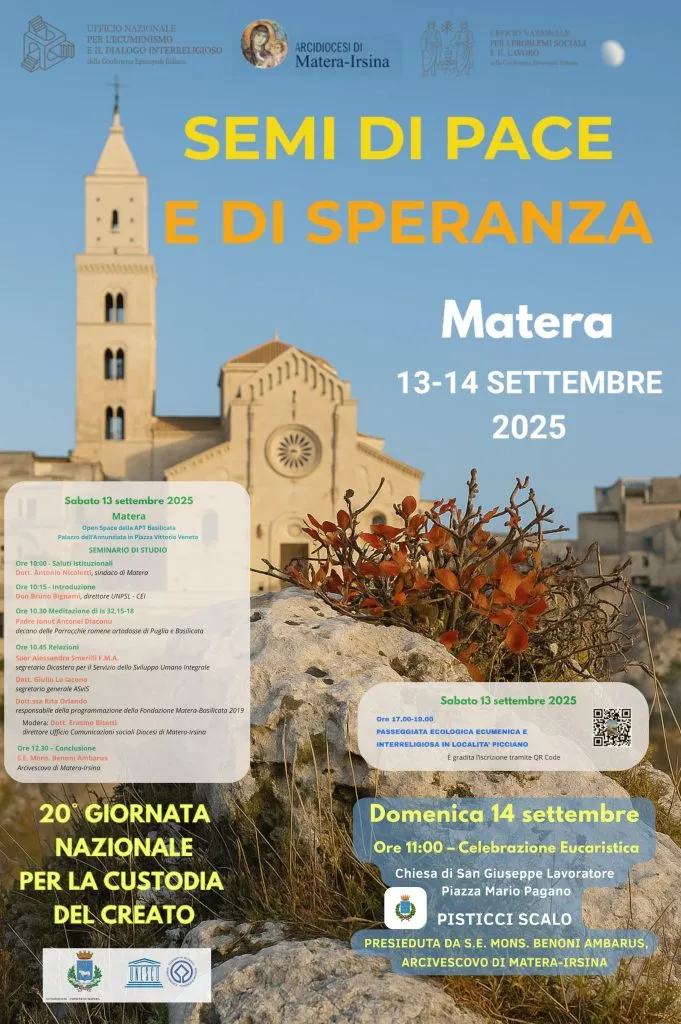 La Giornata Nazionale per la Custodia del Creato 2025, che ha ricevuto il patrocinio dei comuni di Matera e di Pisticci, avrà il momento inaugurale, sabato 13 settembre a Matera con un seminario di studio alle ore 10 nell’Open Space del Palazzo dell’Annunziata: introdurrà i lavori, dopo il saluto del sindaco Antonio Nicoletti, il direttore dell’Ufficio nazionale per i problemi sociali e il lavoro della CEI don Bruno Bignami,