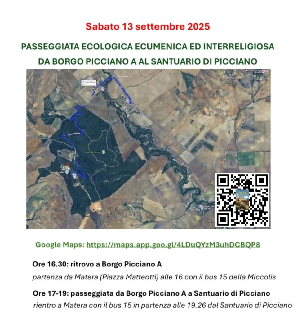 Nel pomeriggio di sabato 13 settembre è in programma una passeggiata ecologica con una importante dimensione ecumenica e interreligiosa, che muoverà alle 16,30 da Borgo Picciano A per concludersi al Santuario di Picciano: lungo il cammino (4,5 km da coprire in circa due ore) si alterneranno canti, meditazioni a cura dei rappresentanti religiosi (chiesa cattolica, battista, ortodossa e religione musulmana) e gli interventi di un esperto naturalista, Vito Santarcangelo, che aiuterà a cogliere la bellezza del nostro territorio ed il valore della salvaguardia del creato.