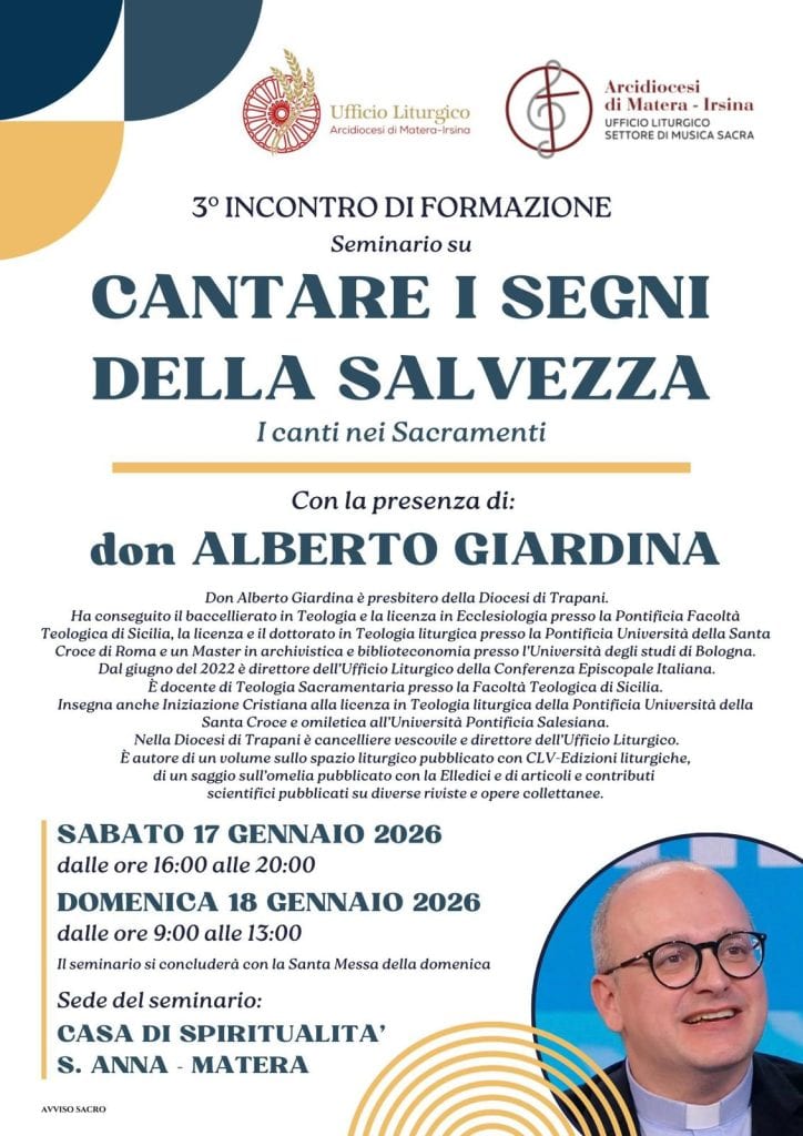 L’Ufficio Liturgico dell’Arcidiocesi di Matera-Irsina, il 17 e 18 gennaio 2026 presso la Casa di Spiritualità “S. Anna”, promuove il 3° Incontro di Formazione.