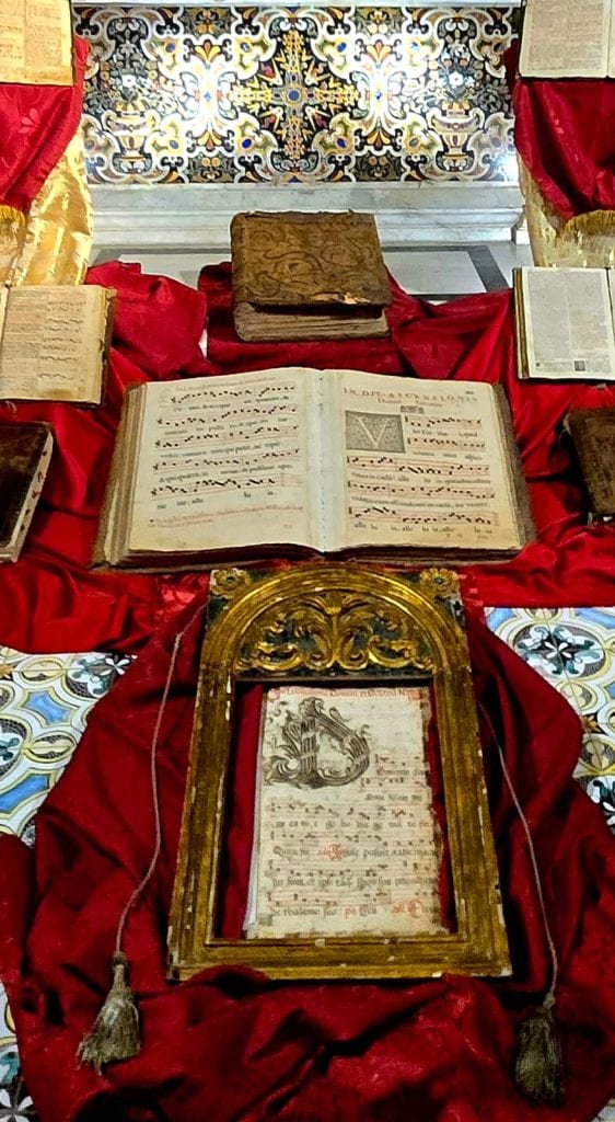 Il dialogo prosegue chiedendo a Scarcia se si hanno notizie storiche di costui: «Il cantore è Don Matteo Montescaglioso, così come rileviamo nelle lettere che s’inseguono, seguendo il verso, sui cartigli decorativi del capolettera. Canonico e cantore, morto nel 1649, commissionò l’antico altare maggiore in legno intagliato e dorato, che includeva la grande tela dell’Assunzione di Maria che ancora sopravvive in fondo al coro, lavoro prezioso fatto arrivare da Venezia. Fu anche lui ad acquistare un altro polittico diviso in nove comparti, sparito nell’Ottocento, misteriosamente!»