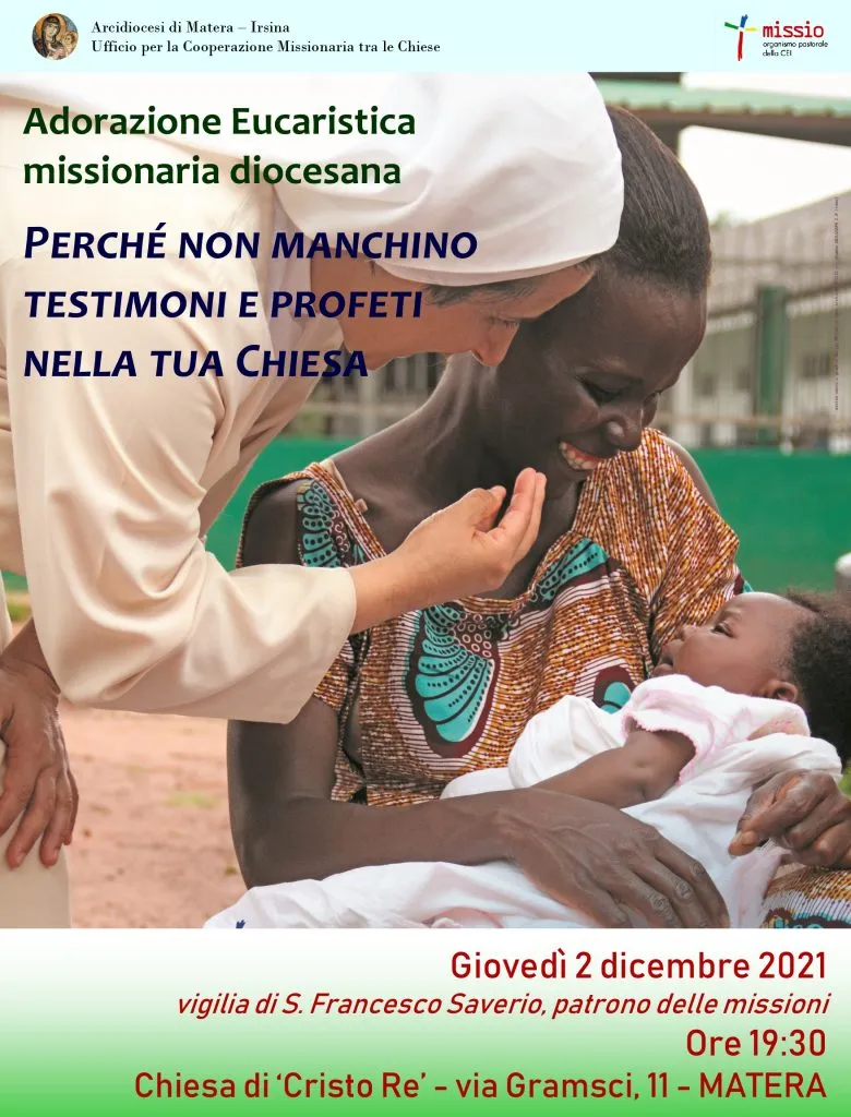 L’Ufficio Diocesano per la Cooperazione Missionaria tra le Chiese ha organizzato un’adorazione eucaristica missionaria per domani 2 dicembre – vigilia della memoria liturgica di S. Francesco Saverio, evangelizzatore del lontano oriente e patrono delle missioni – alle ore 19:30 nella chiesa di “Cristo Re” in Matera, guidata da don Franco Laviola, direttore dello stesso ufficio.