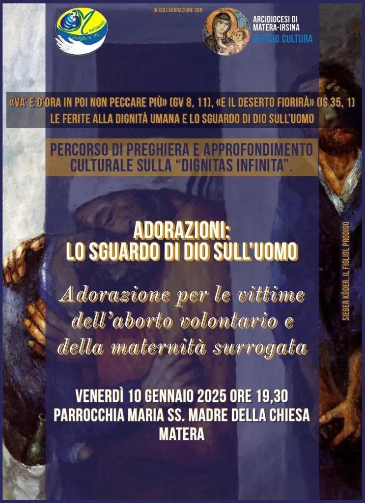 Venerdì 10 gennaio alle ore 19:30, presso la Parrocchia Maria SS. Madre della Chiesa di Matera, si terrà il terzo incontro culturale del percorso di preghiera e di approfondimento culturale sulla "Dignitas infinita", dichiarazione sul tema della dignità umana redatta dal Dicastero per la Dottrina della Fede.
