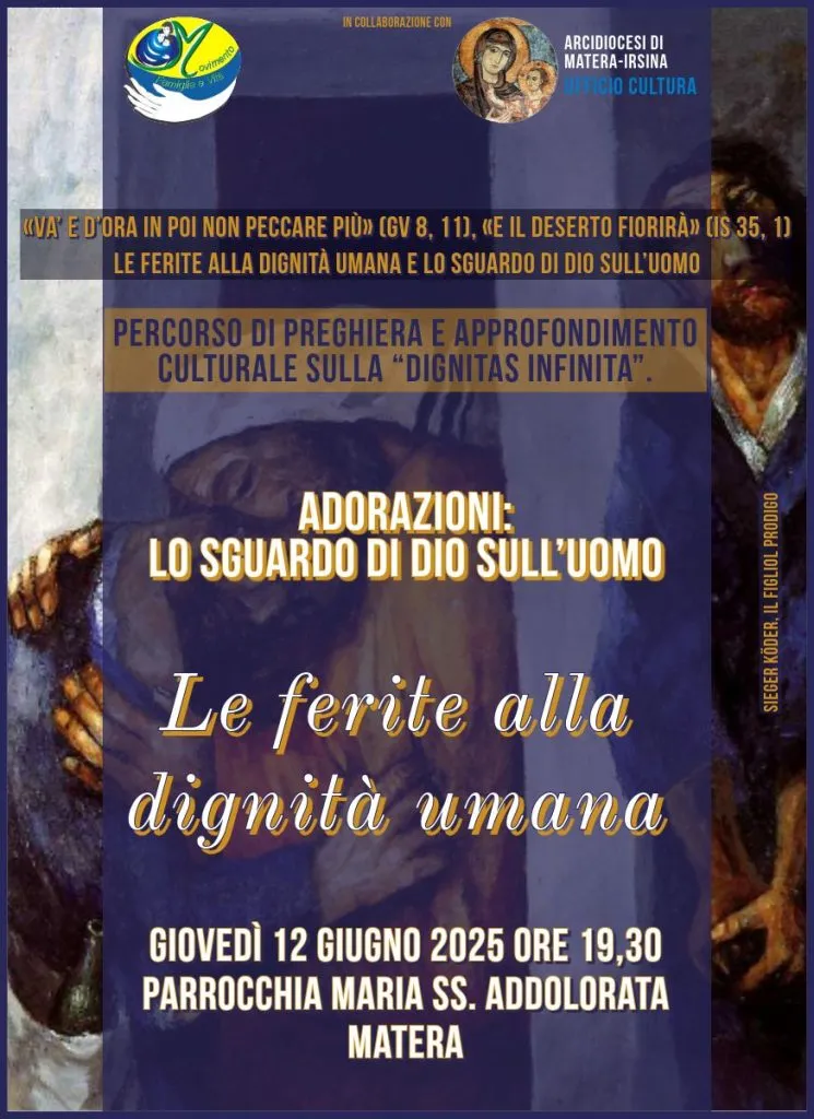 Giovedì 12 giugno alle ore 19:30, presso la Parrocchia Maria SS Addolorata di Matera, si terrà un ulteriore incontro del percorso di preghiera e di approfondimento culturale sulla "Dignitas infinita", Il tema sarà: "Le ferite alla dignità umana".