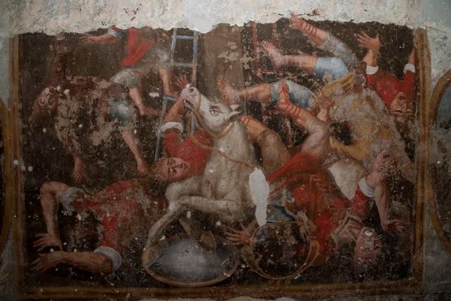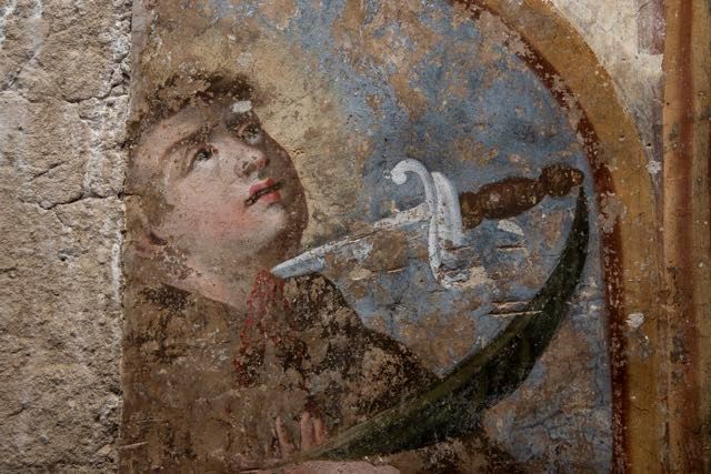 Un repertorio iconografico curioso che grazie all’iscrizione posta sotto una delle scene raffigurate ne riconosciamo il committente: A devozione di Lorenzo D’Amieno, un rinomato notaio pomaricano attivo sul territorio tra il 1724 e il 1763. Gli affreschi rappresentano scene tratte dalle storie di Santa Chiara descritte da Tommaso da Celano e una delle storie della Vita della Vergine. Le quattro lunette sono intervallate da tondi con raffigurazioni di santi dell’Ordine dei Minori, martiri del Marocco. Ben visibili sono le iscrizioni: S. Leone Martire e Sant’Angelo Martire, riconducibili appunto al nucleo dei 7 frati calabresi che nel 1227 partirono come missionari del Vangelo tra i maomettani, condannati quasi tutti alla decapitazione per non aver abiurato alla fede cristiana.