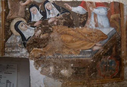 In Santa Chiara Morente l’artista e il committente degli affreschi conoscevano la Leggenda di santa Chiara redatta per incarico di papa Alessandro IV da un frate minore dopo la canonizzazione della santa e datata 1256. Dal numero 39 al 46 viene descritta la sua malattia e il prolungato sfinimento fino alla morte. Appena appresa la notizia dell’imminente morte si affretta papa Innocenzo IV a visitare l’ancella di Cristo insieme ai cardinali e non esita a onorarne la morte con la sua presenza. Entrato nel monastero si dirige al piccolo giaciglio per impartirne il dono della piena assoluzione. Le due dita in posizione benedicente del papa sono ben visibili. Interessante sono le posizioni delle mani della santa, la sinistra sul petto e la destra con il palmo rivolto verso l’alto. Si potrebbe ipotizzare che tale atteggiamento sia riferito al verso 41, quando chiede al papa di baciargli il piede. Infatti il pontefice sembra raffigurato proprio nell’atto di porgergli il piede intuendo, dal panneggio, la gamba destra sollevata.