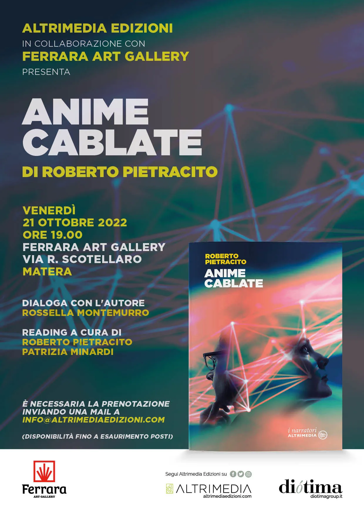 Sarà presentato venerdì 21 ottobre p.v. alle 19 presso Ferrara Art Gallery, in via Rocco Scotellaro a Matera Anime cablate di Roberto Pietracito. Nel corso della serata, moderata dalla giornalista Rossella Montemurro, reading di letture a cura dell’Autore e di Patrizia Minardi. Per assistere alla presentazione è necessaria la prenotazione inviando una mail a info@altrimediaedizioni.com.