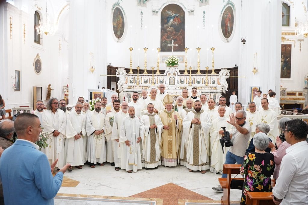 Possiamo sintetizzare con queste parole l’indimenticabile e storico momento che le comunità ecclesiali di Montescaglioso hanno vissuto domenica 17 agosto nella Chiesa madre di Montescaglioso, riunitasi per festeggiare don Nino Martino, padre Alfredo Santoro e padre Tommaso Mianulli, nel loro decimo anniversario di ordinazione sacerdotale. Infatti, proprio nella chiesa matrice, dieci anni fa, i tre, in tre momenti diversi (26 settembre, 17 ottobre e 21 novembre), furono ordinati sacerdoti da S.E. rev.ma mons. Salvatore Ligorio, all’epoca Arcivescovo di Matera-Irsina. Ed è stato proprio mons. Ligorio, invitato dai tre sacerdoti, a presiedere l’Eucarestia, concelebrata da diversi sacerdoti riuniti per condividere la gratitudine a Dio per il dono della vita presbiterale. Alla celebrazione erano anche presenti le diverse Comunità che hanno raccolto le primizie del ministero dei tre sacerdoti e quelle che oggi li accolgono: le Comunità parrocchiali di Maria SS. Annunziata in Scanzano Jonico, di San Lorenzo da Brindisi in Taranto, dell’Immacolata in Trinitapoli, di Sant’Agnese in Matera, le Comunità conventuali cappuccine di Alessano, Rutigliano e Scorrano.