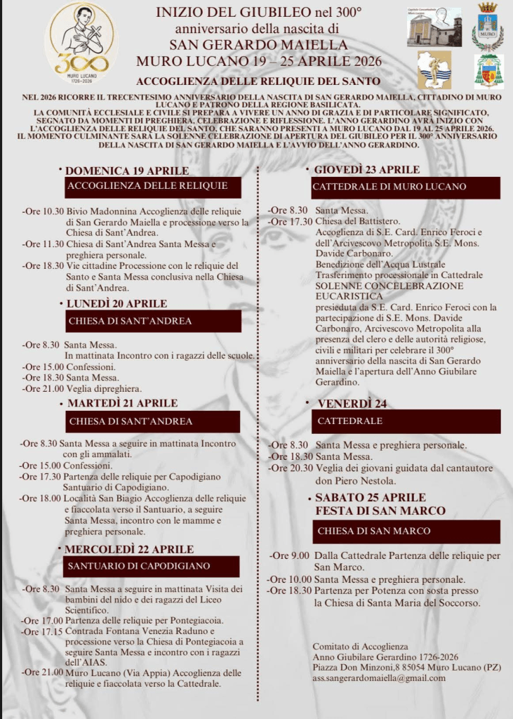 L’iniziativa coinvolgerà non solo Muro Lucano, ma l’intera Basilicata, con un ricco programma di appuntamenti religiosi e comunitari. Particolare rilievo assume la possibilità di ottenere l’indulgenza plenaria: a Muro Lucano durante tutto l’anno, fino al 23 aprile 2027, e in alcune date specifiche indicate nella lettera pastorale scritta da mons. Carbonaro in occasione dei 300 anni dalla nascita di Gerardo Maiella, nelle Cattedrali delle sei diocesi lucane e in diverse chiese lucane intitolate al Santo, tra cui la parrocchia di San Gerardo Maiella in Marconia di Pisticci.