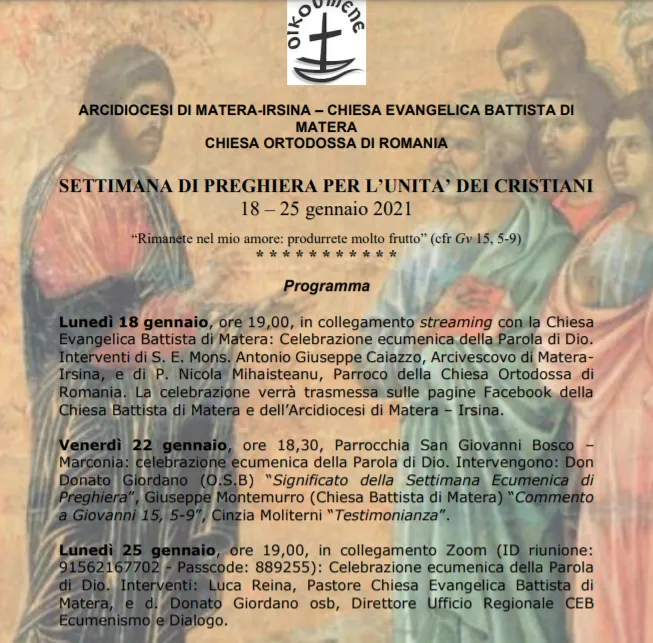Dal 18 al 25 gennaio l’Arcidiocesi di Matera-Irsina, la Chiesa Evangelica Battista di Matera e la Chiesa Ortodossa di Romania organizzano  la settimana di preghiera per l’unità dei cristiani il cui tema proposto quest’anno, dall’apposito gruppo ecumenico, è: “Rimanete nel mio amore: produrrete molto frutto”, che sviluppa la riflessione su Gv 15, 1-17, prima parte del secondo discorso di Gesù ai discepoli dopo l’ultima cena.