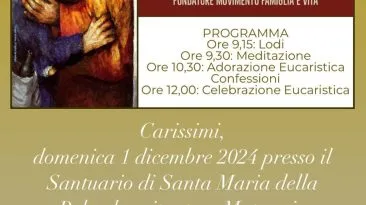 Domenica 1 dicembre alle ore 9:00, presso il Santuario di Santa Maria della Palomba, si terrà il ritiro di Avvento del Movimento Famiglia e Vita.