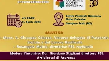 Presentazione della 50^ Settimana Sociale dei Cattolici itialiani nel Centro pastorale Mater Ecclesiae di Garaguso Scalo – 11 aprile ore 18,00.