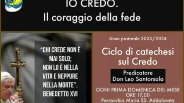 Ciclo di catechesi sul Credo, che saranno tenute ogni prima domenica del mese da don Leo Santorsola alle ore 17,00 presso la parrocchia Maria SS Addolorata di Matera.