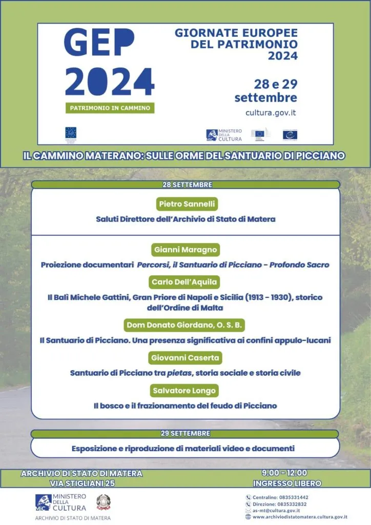 A Matera il 28 e 29 settembre le “Giornate” si sono svolte su varie tematiche ed in diverse location della città. Una delle più interessanti manifestazioni si è tenuta presso l’Archivio di Stato in cui l’attenzione dei numerosi cittadini pervenuti in sala si è posta sul Santuario di Picciano e la sua storia. Diversi e tutti bravi i relatori che si sono avvicendati nelle varie relazioni che hanno affrontato ognuno un aspetto particolare e suggestivo della storia di Picciano dalla nascita come insediamento benedettino intorno all’anno mille, al suo vivere e svilupparsi nel Medioevo fino all’inizio del ‘700, all’abbandono e alla successiva rinascita come luogo di preghiera, che vive oggi un nuovo fulgore di monachesimo obbediente alla regola benedettina della Congregazione monastica olivetana dell’Ordine di San Benedetto.