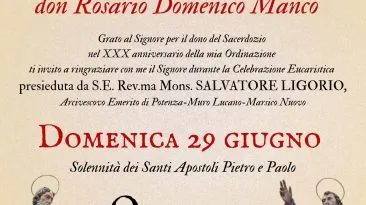 Domenica 29 giugno alle ore 19, presso la Chiesa Madre in Pisticci, don Rosario Manco ringrazierà il Signore con la celebrazione eucaristica presieduta da mons...