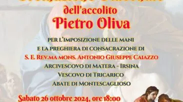 Sabato 26 ottobre 2024 si terrà, presso la Parrocchia Santa Lucia di Montescaglioso, per l'imposizione delle mani e la preghiera consacratoria di mons. Antonio Giuseppe...
