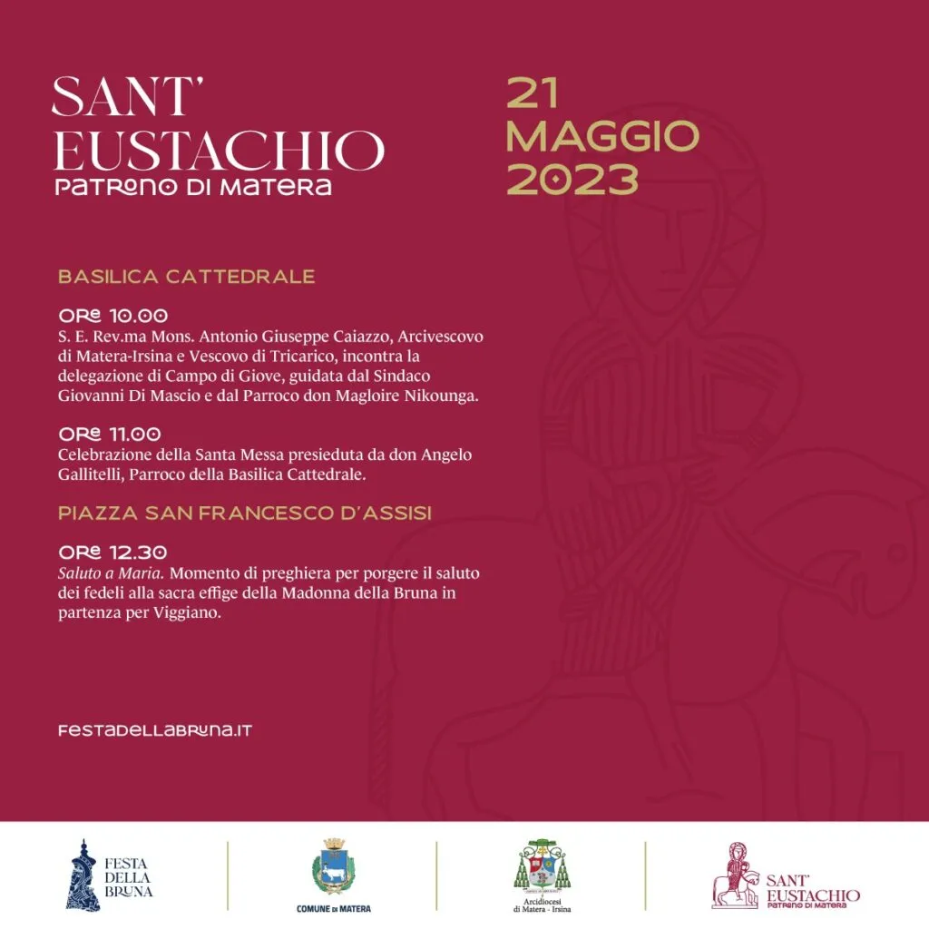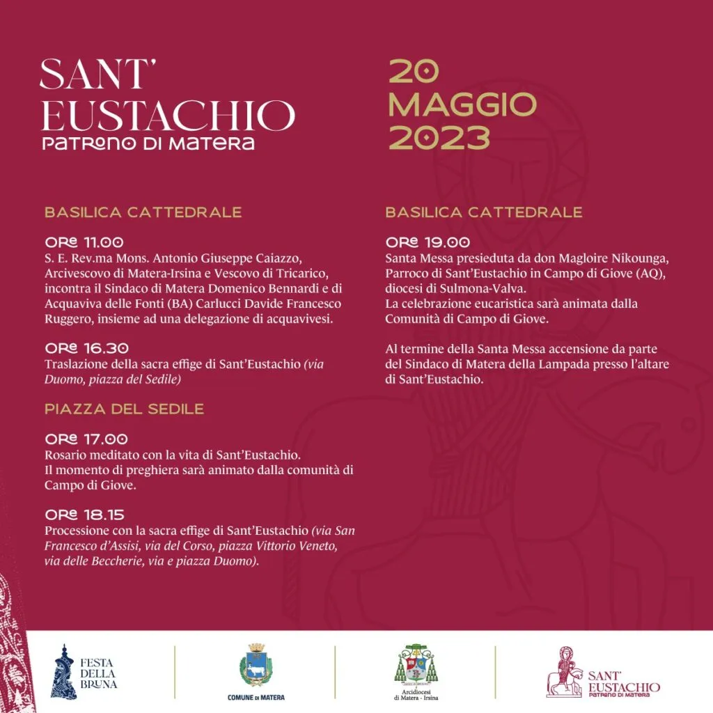 L’Associazione Maria SS. della Bruna comunica che nei giorni 20 e 21 maggio 2023 avranno luogo le celebrazioni in onore di Sant’Eustachio, patrono di Matera. Le due giornate di festa vedranno la partecipazione delle comunità di Acquaviva delle Fonti (BA) e di Campo di Giove (AQ), a motivo del patto di amicizia stipulato col comune di Matera e alle quali ci accomuna l’avere come patrono Sant’Eustachio. Di seguito il programma dei due giorni.