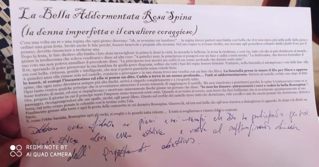 Si termina con un laboratorio in cui si chiede ai presenti di fare un percorso introspettivo attraverso le favole per riconoscere, attraverso i personaggi, le relazioni e gli eventi, le difficoltà che spesso si vivono nelle relazioni.