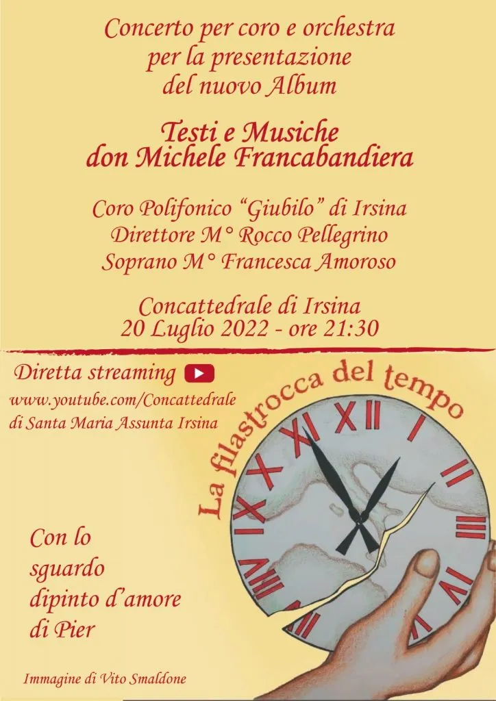 Mercoledì 20 luglio 2022 alle ore 21,30 presso la concattedrale di Irsina si terrà un concerto con il Coro Polifonico "Giubilo". Direttore maestro Rocco Pellegrino, soprano maestro Francesca Amoroso. Testi e musiche di don Michele Francabandiera. Diretta streaming su: www.youtube.com/Concattedrale di Santa Maria Assunta Irsina