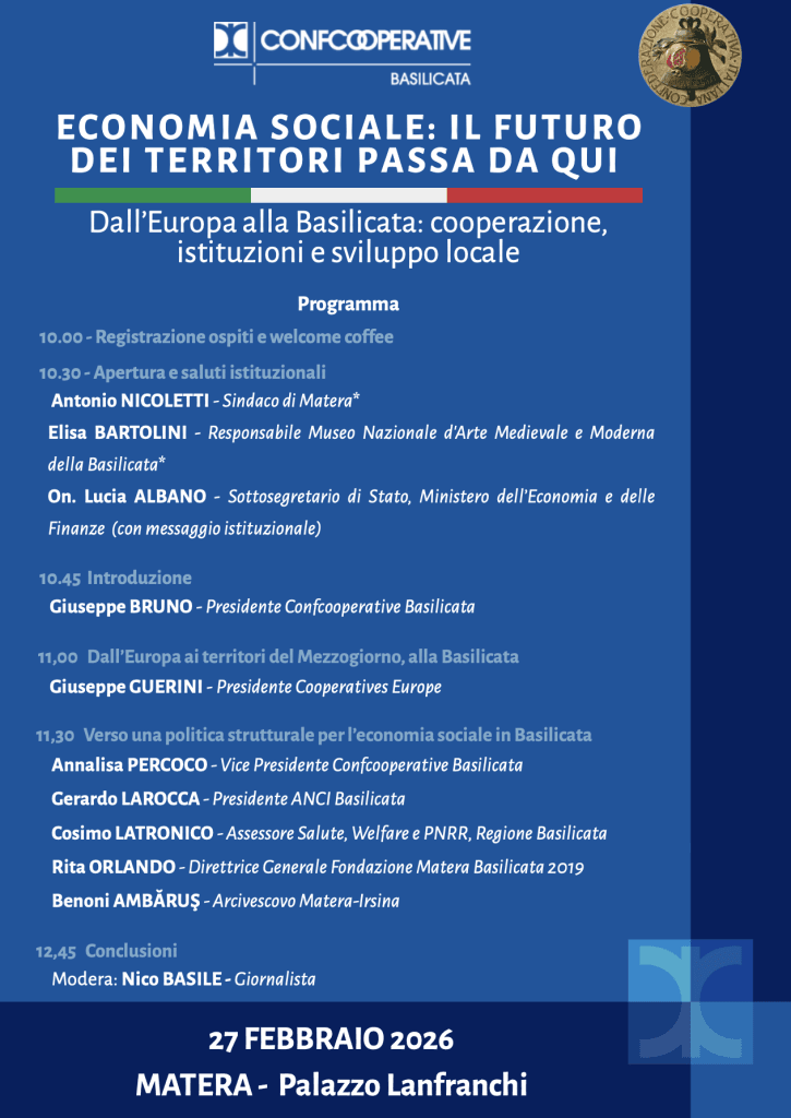 L’iniziativa rappresenta una tappa fondamentale e si pone in diretta continuità con la Giornata Cooperativa tenutasi lo scorso 2 dicembre a Brindisi di Montagna. In quell’occasione, Confcooperative Basilicata aveva aperto ufficialmente il dialogo con la Regione, presentando una bozza per il Piano Regionale dell’Economia Sociale 2025-2030, strutturata su cinque assi strategici. L’incontro nasce proprio con l’intento di riprendere quel documento di indirizzo e tradurlo in azioni concrete.