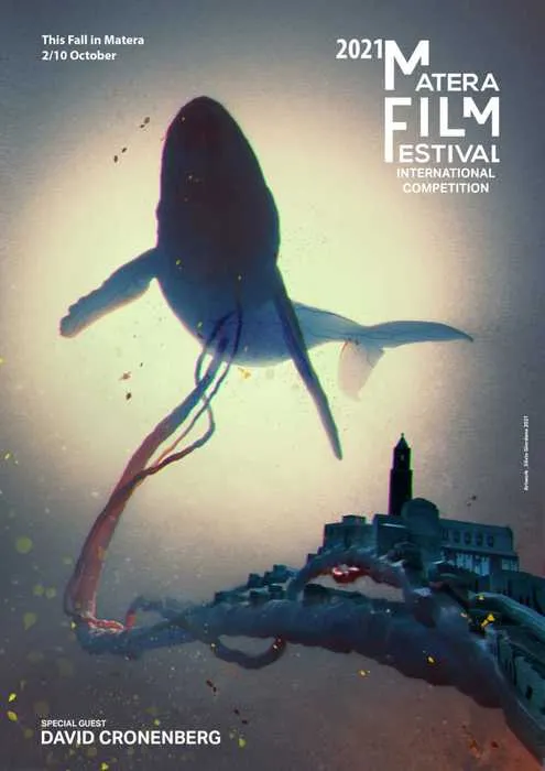 ll simbolo del festival è la balena ‘Giuliana’, il più grande cetaceo del Pleistocene mai scoperto, rinvenuto nel 2006 sulle sponde del Lago di San Giuliano, da cui prende il nome. La locandina ufficiale di quest’anno, realizzata dal creative director Silvio Giordano, vede la balena con un cordone ombelicale collegato alla terza città più antica del mondo: Matera. Attraverso il sangue contenuto nel cordone ombelicale riceve nutrimento e ossigeno da essa. Come la madre con il figlio. Come il nostro rapporto con il pianeta Terra sempre più labile e contaminato. Il cordone ombelicale è un chiaro riferimento alla “bioporta” del film eXistenZ di David Cronenberg, pronta a collegarci in un mondo parallelo realistico. I colori scelti sono quelli autunnali del mese di ottobre e l’ambientazione ha una atmosfera sconosciuta e primordiale. La balena del MFF del 2021 ci ricorda come tutti noi veniamo dal buio dell’utero e nel buio torneremo. Ma nel mezzo di questo percorso possiamo trovare luce e creare luce. Per noi la luce è anche il cinema.