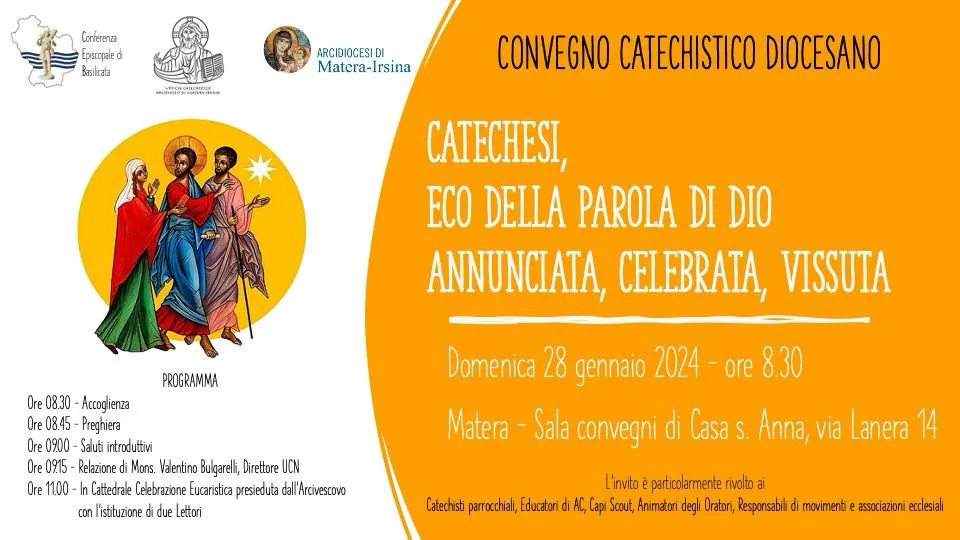 Catechesi, Eco della Parola di Dio annunciata, celebrata, vissuta. Il Convegno si terrà domenica 28 gennaio a partire dalle ore 8,30 presso la Sala convegni di Casa S. Anna sita in Via Lanera 14 in Matera. L'invito è particolarmente rivolto ai catechisti parrocchiali, educatori di AC, capi scout, animatori degli Oratori, responsabili dei Movimenti e Associazioni ecclesiali.