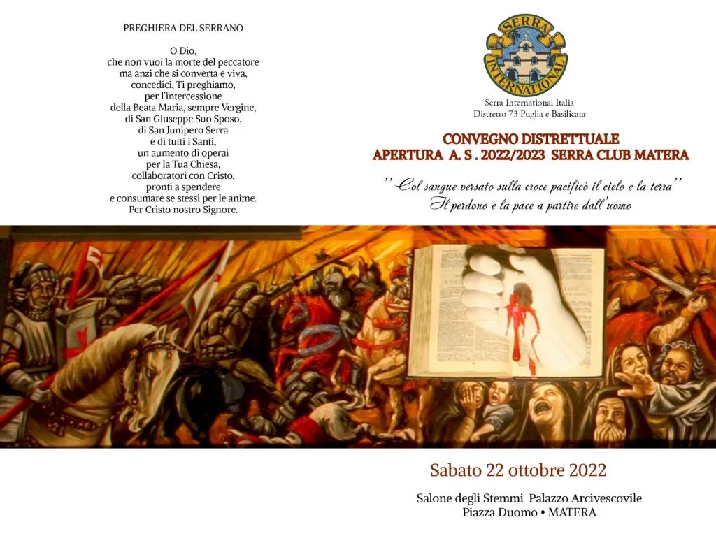 Sabato 22 ottobre 2022 alle ore 9,00 nel Salone degli Stemmi del Palazzo Arcivescovile di Matera si terrà il secondo incontro del Distretto 73 che comprende 7 club tra Puglia e Basilicata. Il Serra International Italia è un’associazione cattolica che si propone la diffusione della cultura cristiana e si impegna a promuovere nella società civile una cultura favorevole alle vocazioni fondamentali della vita, in particolare a quelle del sacerdozio e della vita consacrata.