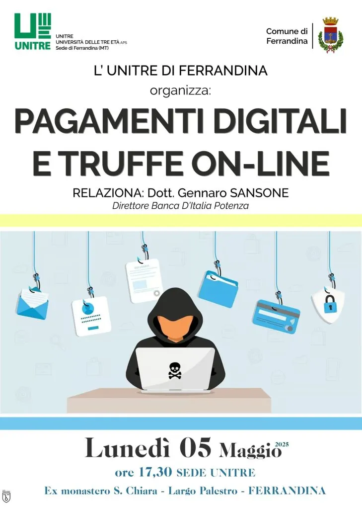 Lunedì 5 maggio 2025 alle 17,30 presso la sede sociale, l'Unitre di Ferrandina, in collaborazione con il Comune di Ferrandina, ha organizzato un convegno formativo su un argomento di grande attualità che coinvolge soprattutto le persone poco digitalizzate.