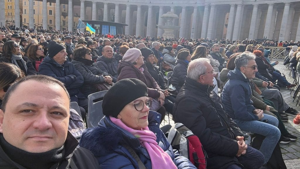 Una marea di 35000 coristi affollava paziente l’immensa Piazza San Pietro in settori disposti con cura certosina. Una grande macchina organizzativa ripete il miracolo ogni domenica e in occasione delle udienze papali. Il freddo pungente ci ha fatti bardare fino all’inverosimile, rendendoci quasi irriconoscibili, ma i canti spontanei nelle diverse lingue ci identificavano come “apostolato laico”.