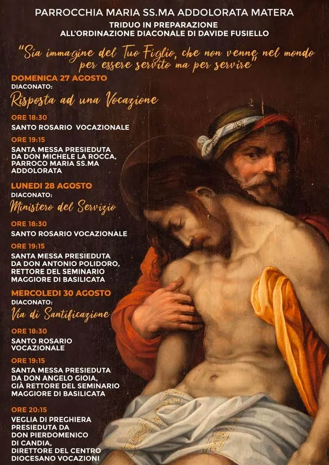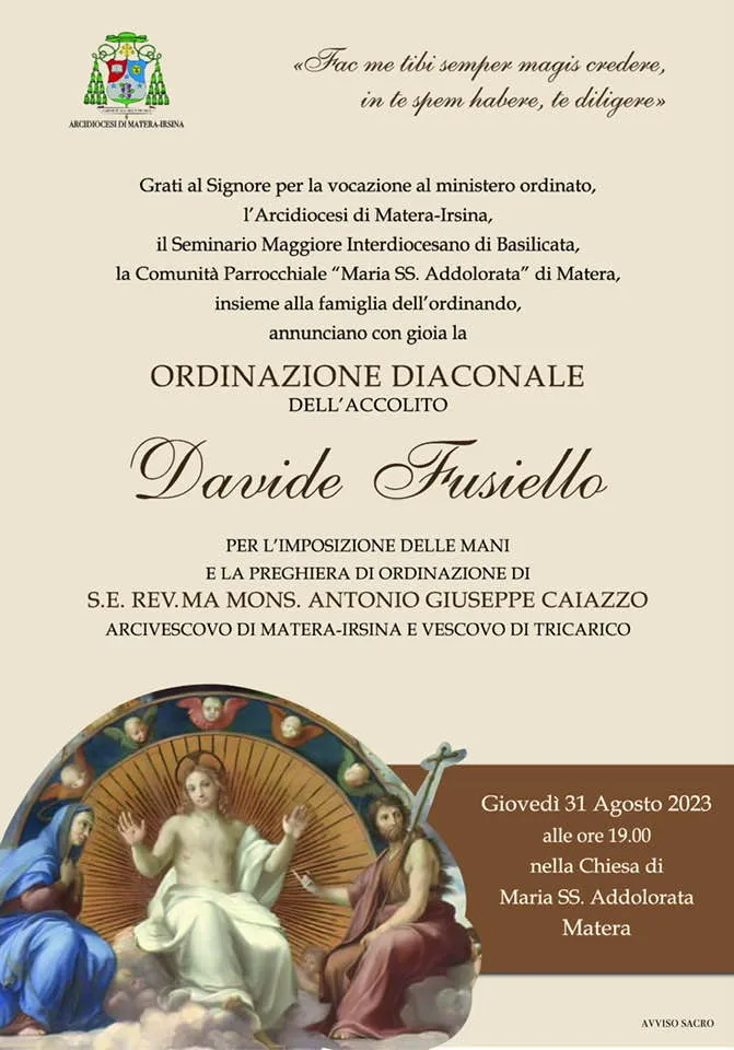 «Sono Davide Fusiello, nato a Matera – primo di due figli – da genitori materani, il 1° marzo 1997. Abitavo di fronte alla chiesa di “S. Giacomo”: don Franco Taccardi era il parroco e don Michele La Rocca vi svolgeva il tirocinio pastorale previsto negli ultimi anni di seminario.