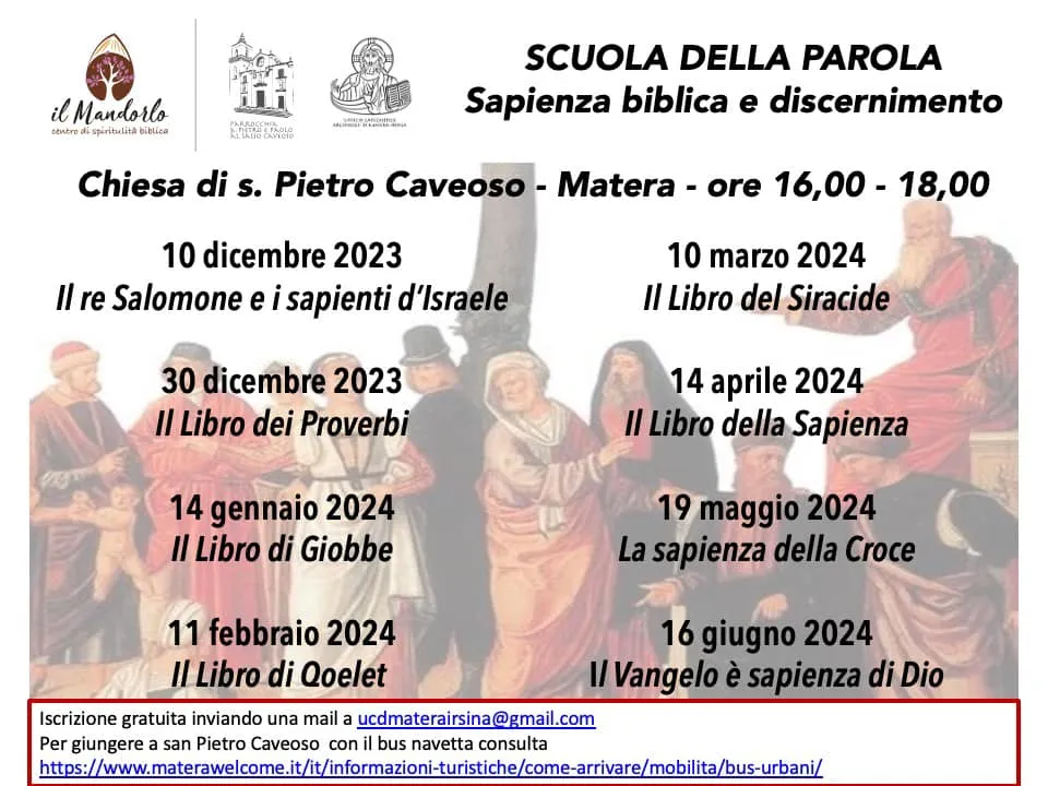 Con la Scuola della Parola prendono avvio le attività del Centro di spiritualità biblica “Il Mandorlo”, che ha sede presso la parrocchia Ss. Pietro e Paolo al Sasso Caveoso e che concretizza una richiesta e una esigenza sorte nel Sinodo Diocesano.