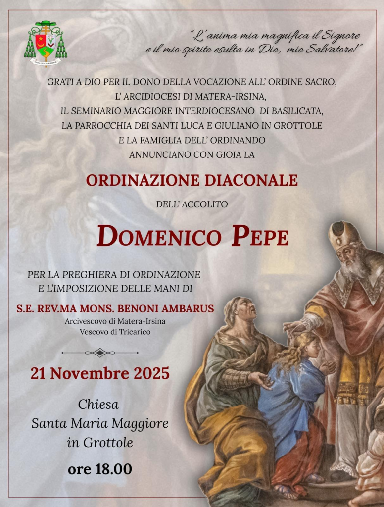 Venerdì 21 novembre, festa della Presentazione della Beata Vergine Maria al Tempio, alle ore 18, tra la “sua” comunità cristiana di sempre, dove nasce la sua vocazione al sacerdozio ministeriale, nella chiesa di Santa Maria Maggiore in Grottole, per l’imposizione delle mani e la preghiera consacratoria del nostro pastore S. E. Rev.ma Mons. Benoni Ambarus, Domenico diviene diacono.
