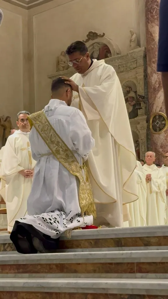 Il dialogo tra l’eletto e il Vescovo – impegni a libera adesione scanditi l’uno dopo l’altro dalla risposta dell’eletto “Sì, lo voglio” e, infine, “Sì, con l’aiuto di Dio, lo voglio”, che rimandano a quel dialogo tra Cristo risorto e Pietro scandito dalle domande “Mi ami tu, più di costoro?” e, in ultimo, “Mi vuoi bene?” cui segue l’affidamento a Pietro della Santa Chiesa – concluso dal gesto pregnante delle consegna delle mani di don Davide in quelle del vescovo – segno della consegna obbediente della vita di don Davide nelle mani di Mons. Caiazzo e dei suoi successori – e il suggestivo canto, con don Davide prostrato sul presbiterio, delle litanie dei santi, hanno preparato al momento vero e proprio dell’amministrazione dell’ordine: l’imposizione delle mani – da parte prima del vescovo e poi, in religioso silenzio, di tutti i presbiteri, segno di infusione dello Spirito Santo – e la preghiera di ordinazione – una bellissima invocazione ricca di rimandi alla storia della salvezza, in particolare al sacerdozio di Aronne – pronunciata dal Vescovo.