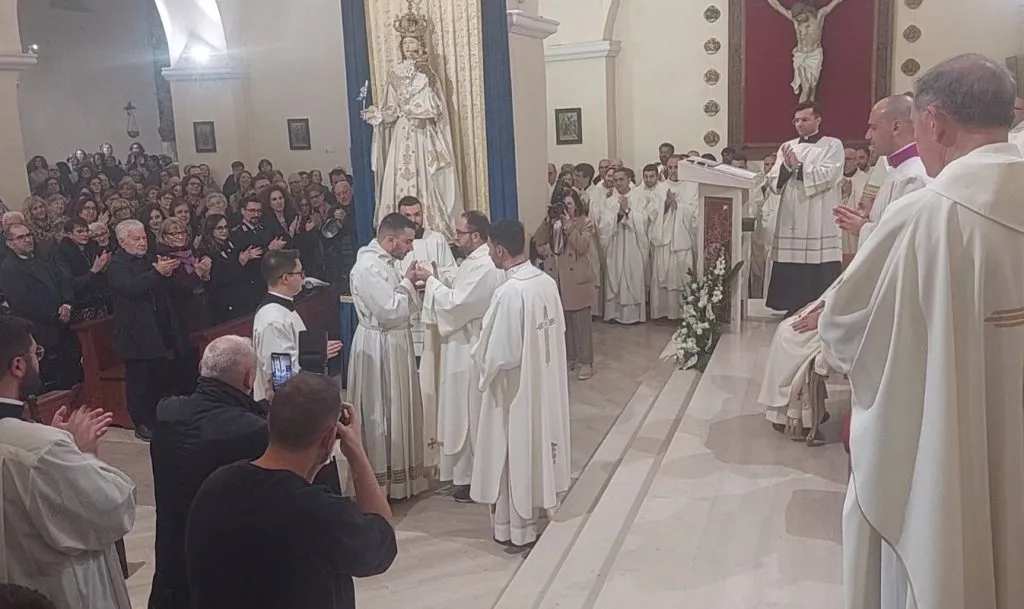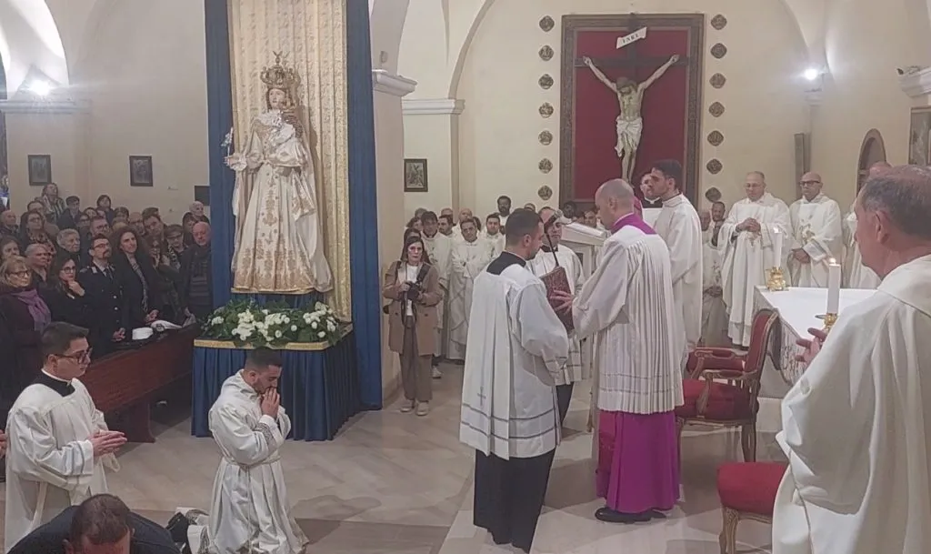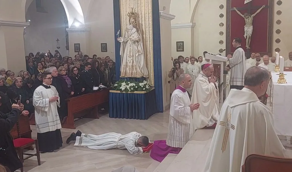 Una dimensione umanamente vivace che ha reso ancor più efficaci i diversi momenti del rito di ordinazione diaconale: la presentazione del candidato diacono, la successiva richiesta del rettore del seminario al vescovo di ammissione di Domenico agli ordini sacri, confermata dalla dichiarazione di “degnità” sulla base dalle informazioni raccolte presso il popolo di Dio, la prostrazione accompagnata dall’invocazione dei santi nel canto delle litanie, l’imposizione delle mani del vescovo e la consegna del libro dei vangeli, i riti esplicativi di vestizione da parte di due compagni di seminario, anche loro novelli diaconi, l’abbraccio con il vescovo ordinante.