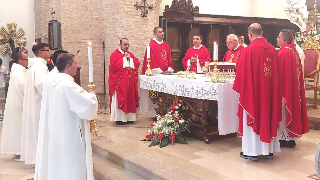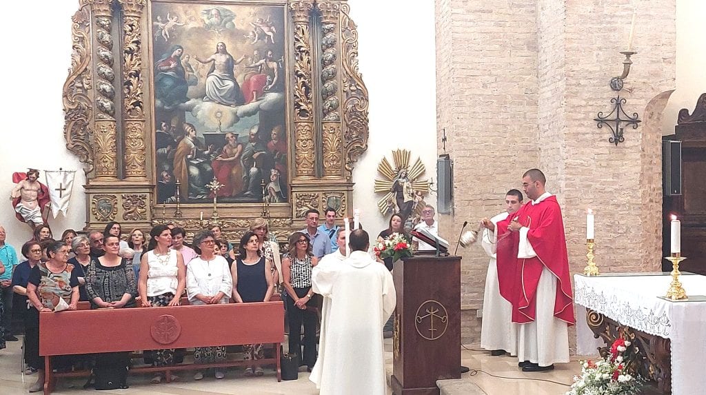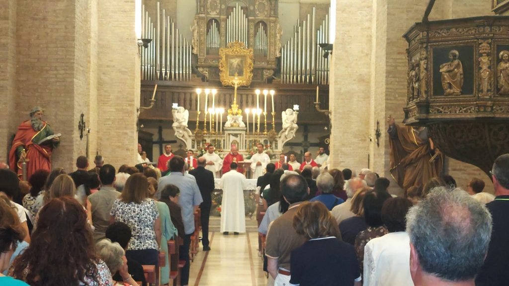 Il presbiterio è pieno di sacerdoti, seminaristi e ministranti. Il bianco e rosso delle vesti liturgiche, che i ministri indossano nel giorno della festa dei martiri Pietro e Paolo, ritorna nel colore dei fiori che solennemente adornano la chiesa.