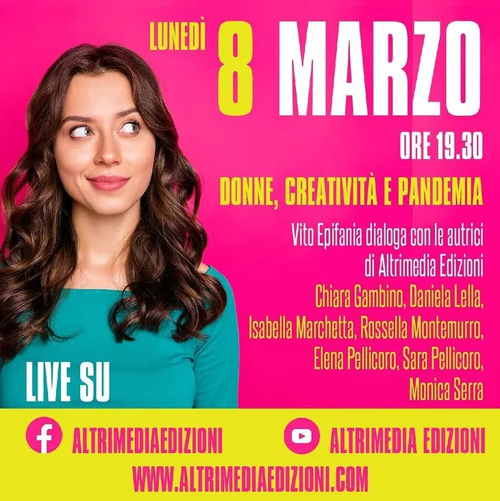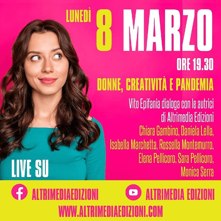 In una giornata simbolica per le donne, che quest’anno si carica di nuovi significati alla luce dell’emergenza sanitaria che stiamo affrontando, l’editore Vito Epifania dialogherà con alcune autrici di Altrimedia: Chiara Gambino, Daniela Lella, Isabella Marchetta, Rossella Montemurro Elena Pellicoro, Sara Pellicoro e Monica Serra.