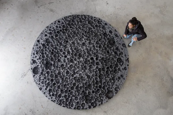 Punto di contatto di Gisella Chaudry – due grandi cerchi, del diametro di 3 metri, in polistirene espanso con grafite e combustione che raccontano l’energia e il movimento della materia e del segno che scandiscono la vita nel tempo presente – e T di Paolo Grassino, due sculture in alluminio di figure umane unite dall’attraversamento crudele di una putrella, che racconta il dramma e l’esistenza umana – si fondono in un corpo a corpo intenso, in una narrazione unica che tesse le trame del pensiero dei due artisti.
