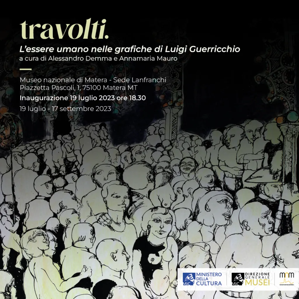 La mostra travolti. L’essere umano nelle opere grafiche di Luigi Guerricchio, esposta nella. Sala delle Arcate, vuole ricostruire una storia sull’essere umano, la sua identità, la sua presenza, attraverso il lavoro dedicato ai linguaggi della grafica – acqueforti, xilografie, litografie, incisioni, etc. – di Luigi Guerricchio. Un viaggio antropologico e sociologico che fa immergere lo spettatore tra i volti di un tempo, quelli del Novecento, che l’artista materano ha attraversato e indagato con una visione unica e significativa.