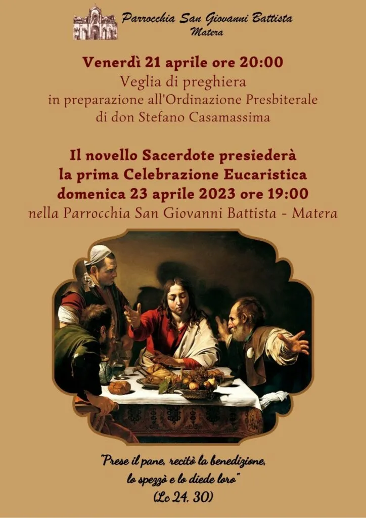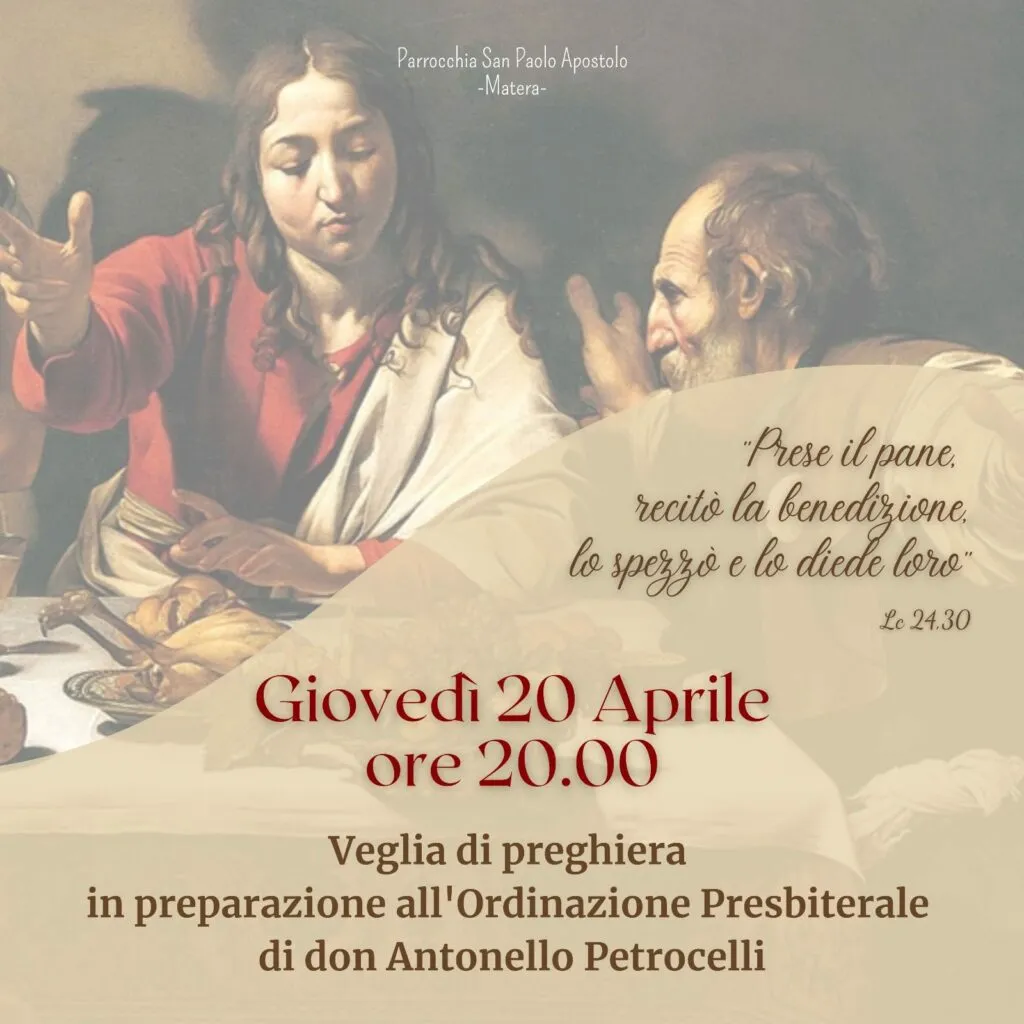 Per questo, in questi giorni, siamo chiamati a pregare per loro e in particolare per giovedì 20 e venerdì 21 aprile, alle ore 20, sono state organizzate due veglie di preghiera, rispettivamente nelle parrocchie di S. Paolo e S. Giovanni, comunità di appartenenza di don Antonello e don Stefano, per accompagnarli al grande passo dell’indomani.