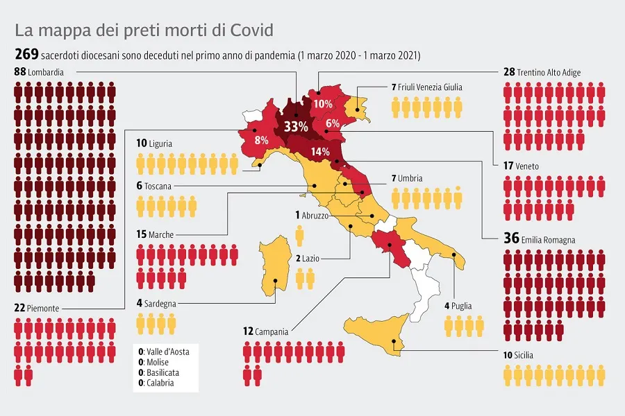 Sono 269 i sacerdoti diocesani morti a causa del Covid-19 in Italia nel primo anno della pandemia. Dall’1 marzo 2020 all’1 marzo 2021, il clero delle diocesi italiane ha pagato duramente le conseguenze del contagio. Lo riferisce l’agenzia di informazione religiosa AgenSIR. Le Regioni più colpite sono state quelle del Nord (78% del totale), particolarmente la Lombardia con 88 decessi. Il contagio ha quasi azzerato il pur modesto ricambio generazionale, garantito dalle nuove ordinazioni, che nel 2020 sono state in tutto 299.