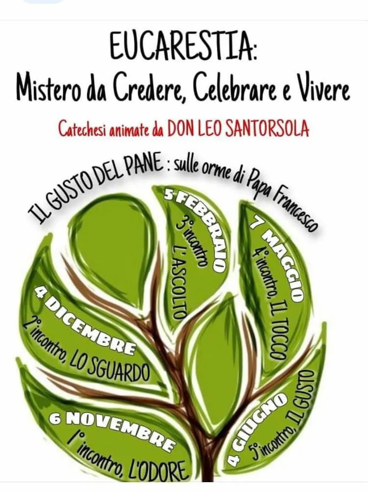 In continuità con l'omelia della Messa del Papa, celebrata in occasione del Congresso eucaristico a Matera, don Leo Santorsola sviluppa un programma di catechesi presso la Parrocchia Maria SS Addolorata di Matera. Il primo incontro si è tenuto il 6 novembre scorso. Il secondo si terrà il 4 dicembre prossimo alle ore 17,00. I successivi incontri si terranno il 5 febbraio, il 7 maggio ed infine il 4 giugno.