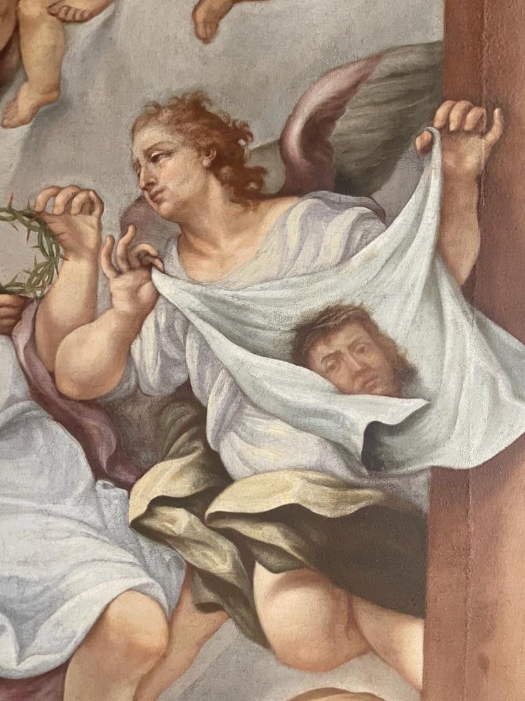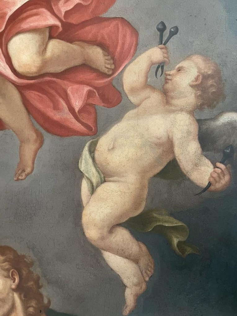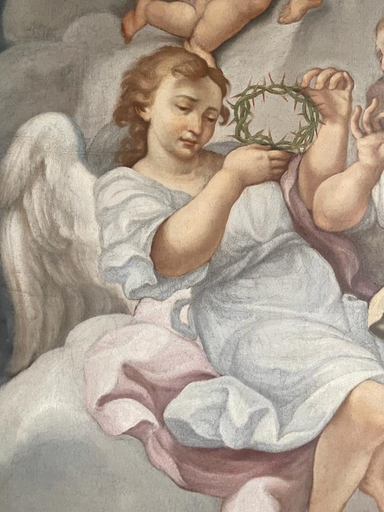 In alto, sono gli strumenti della passione: la corona di spine, le tenaglie con cui sono stati staccati i chiodi dalla croce per poterne deporre Gesù, la canna con cui fu porto a Gesù l’aceto quando chiese da bere, ma soprattutto la veronica, svolazzante nel dipinto. Strumenti di morte che, innalzati dagli angeli, come vuole l’evangelista Giovanni diventano strumenti di gloria e sembrano così riecheggiare le parole di Isaia: